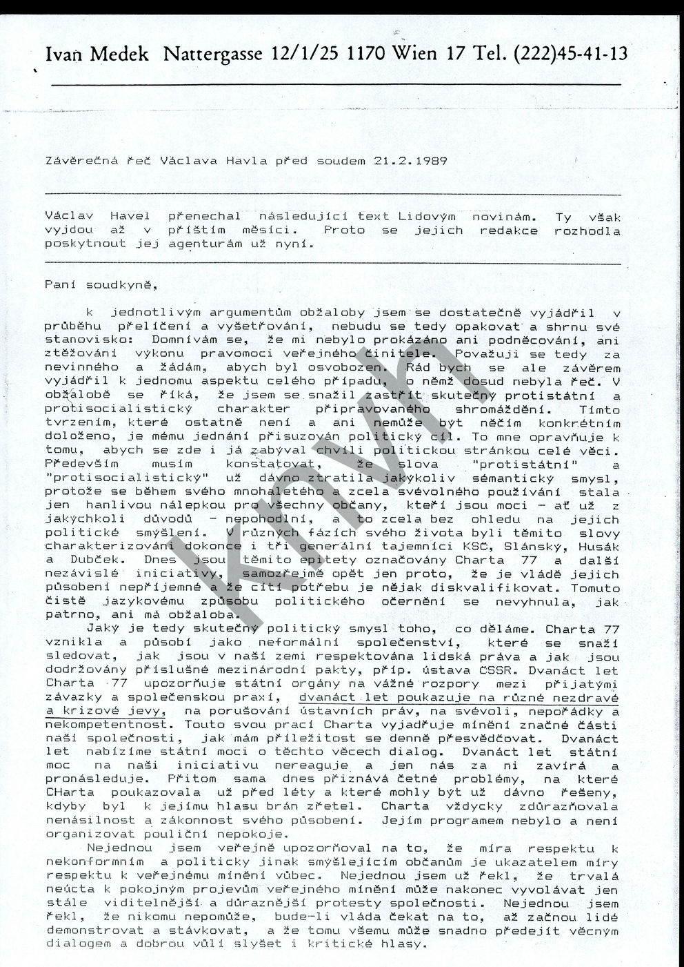- The New York Review of books 1989/7, str. 41: A Statement to the Court