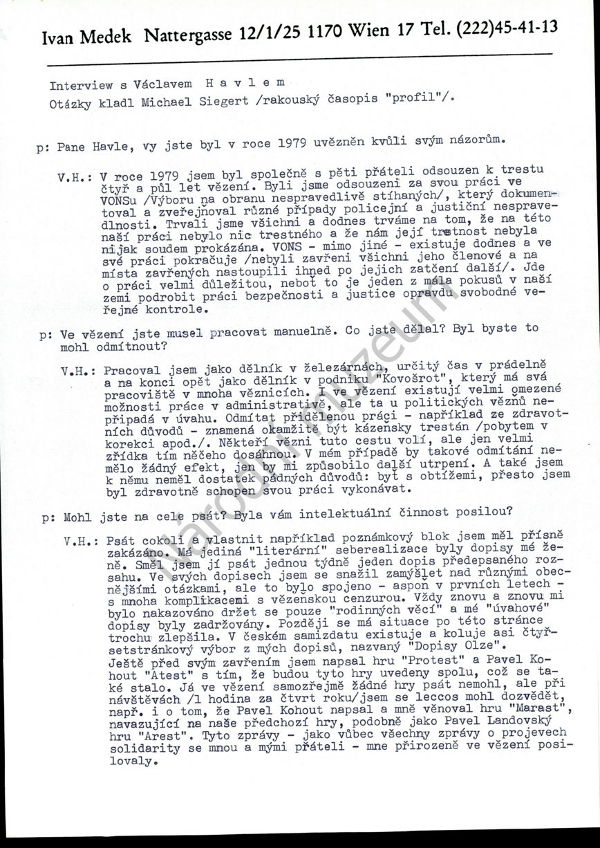 - Interview s Václavem Havlem (Michael Siegert) pro časopis Profil (rukopis)
