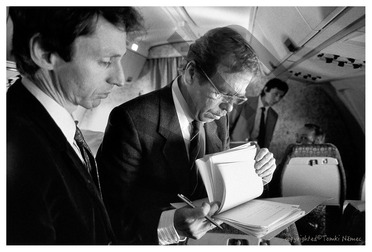Kanada / Toronto: Václav Havel probírá písemné materiály během letu do Washingtonu D. C.