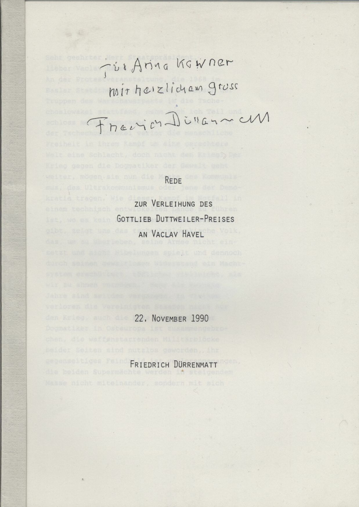 - Cena Gottlieba Duttweilera pro Václava Havla, laudatio Friedricha Dürrenmatta