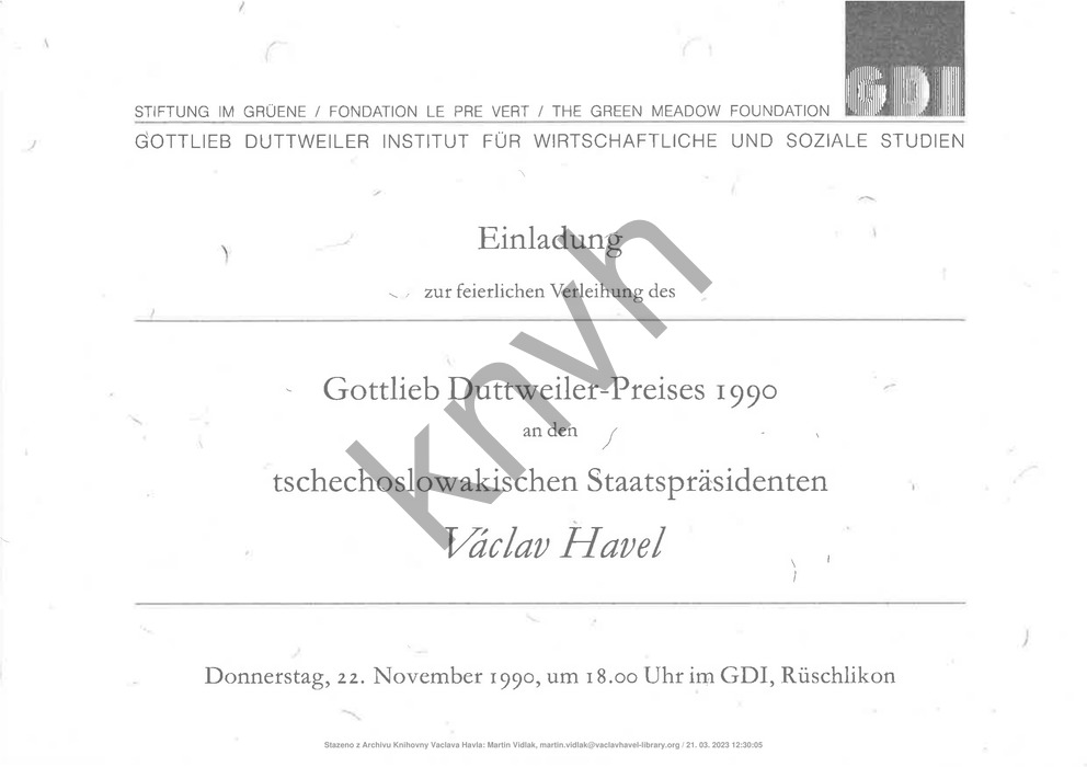 Pozvánka na slavnostní udělení Ceny Gottlieba Duttweilera prezidentu České a Slovenské Federativní Republiky Václavu Havlovi 22. 11. 1990
