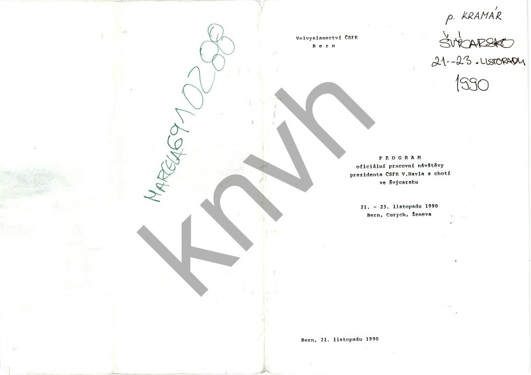 Program oficiální pracovní návštěvy prezidenta ČSFR Václava Havla s chotí ve Švýcarsku 21. - 23. 11. 1990