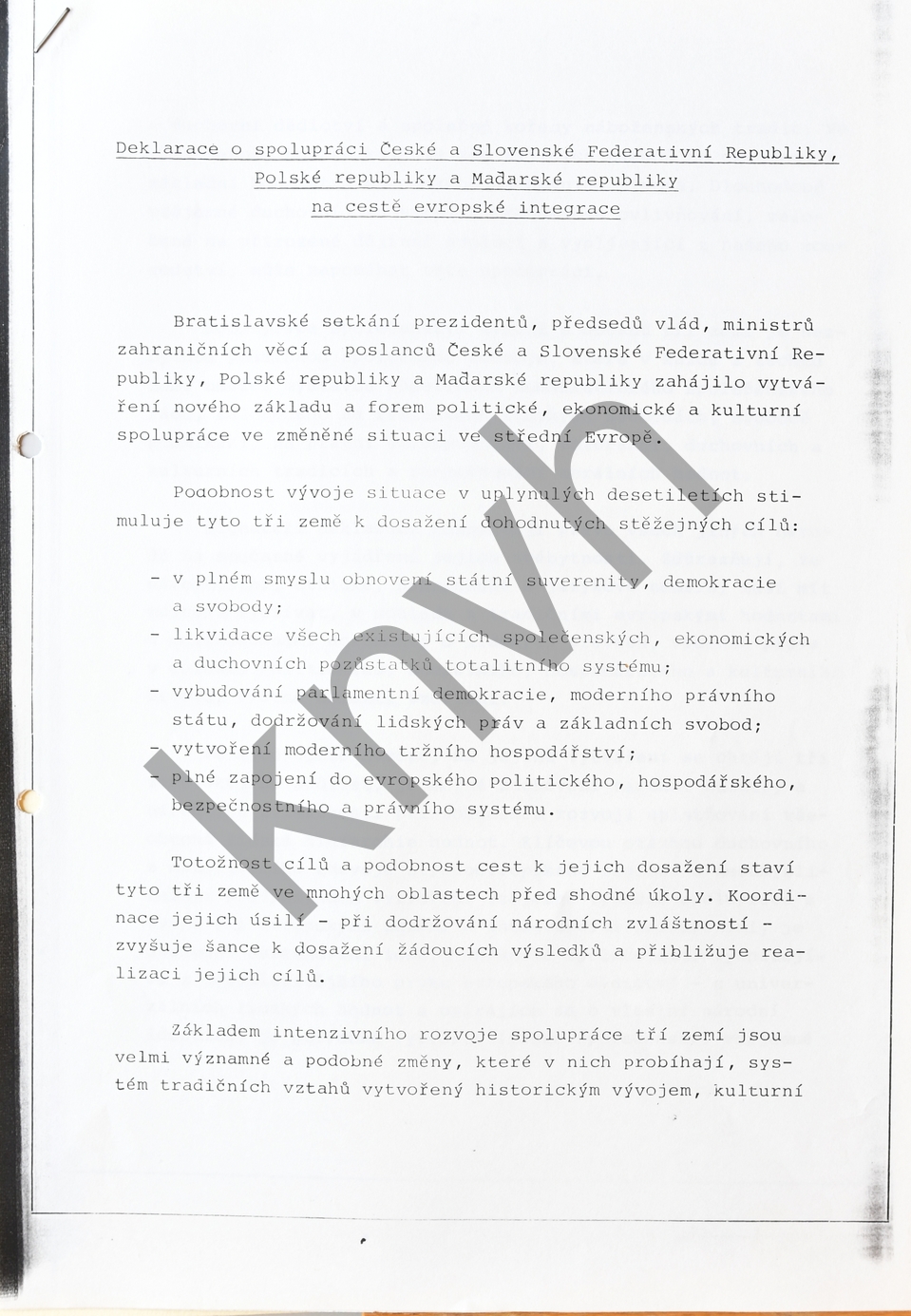 - Deklarace o spolupráci České a Slovenské Federativní Republiky, Polské republiky a Maďarské republiky na cestě evropské integrace 15. 2. 1991